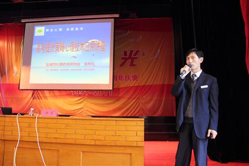 早晨起来对着镜子说:“我热爱学习,我喜欢学习,我上课的时候注意力高度集中。”“我每天有规律地生活,我上课认真听讲!” “我是一个有爱心的人,我爱我自己,我也爱别人。” “我积极乐观地看待每一件事情,我相信最好的事情会发生在我的身上。”5月11日,由盐城团市委、盐城市心理咨询师协会联合主办的“12355”阳光行动启动暨2013年“轻松备考12355与你同行”公益讲堂进校园活动在市明达中学举行,中国心理学会高级会员、市心理咨询师协会理事长张怀礼,现场为200多名考生及老师做了题为《高考提分策略心理技术应用》的专题讲座。