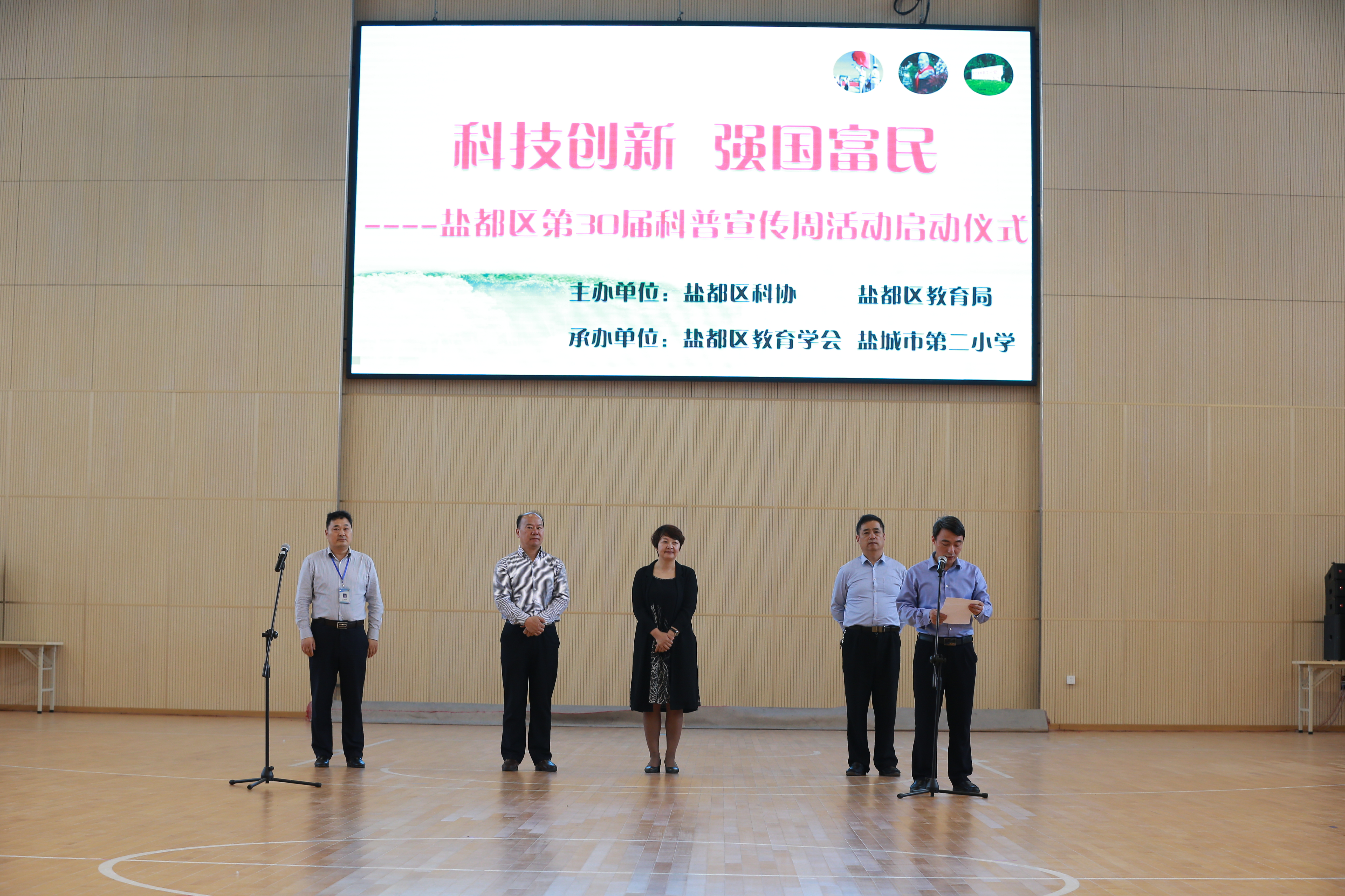 5月19日上午,盐都区第三十届科普宣传周活动启动仪式在盐城市第二小学举行,本次活动的主题为“科技创新 强国富民”。盐城市科技馆、盐都区科协、盐都区教育局相关领导,盐都区各学校科技教育工作负责人、科技辅导员、优秀班主任,市二小部分学生、家长及教师代表共800多人参加了本次活动。活动由区科协主席邓华同志主持。启动仪式上,盐都区教育局副局长李建国、市二小科技辅导员吴海明和科技竞赛获奖学生代表仇孝朗分别发言。