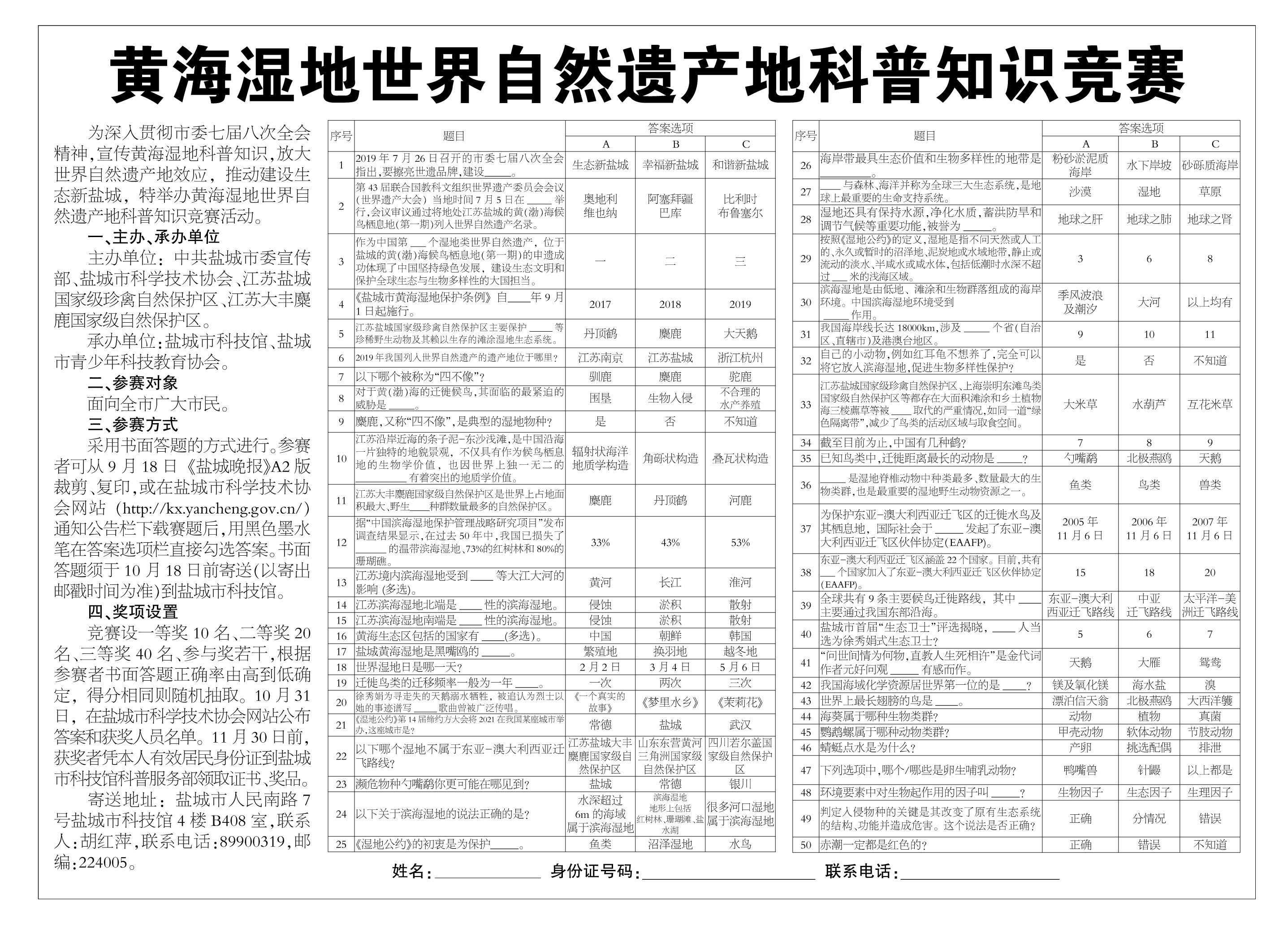 为深入贯彻市委七届八次全会精神,宣传黄海湿地科普知识,放大世界自然遗产地效应,推动建设生态新盐城,特举办黄海湿地世界自然遗产地科普知识竞赛活动。