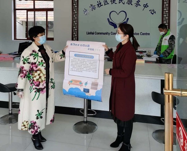 阜宁县科协主席周婧苏向林海社区赠送防疫科普挂图
