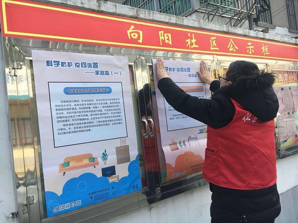 向阳社区工作人员在宣传公示栏内张贴防疫科普挂图