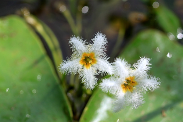金银莲花(Nymphoides indica)属于睡菜科(Menyanthaceae)莕菜属的浮水植物。金银莲花别名印度莕菜、白花莕菜,多年生,生长快,叶浮于水面,圆形或卵形而基部具一深缺裂,厚质,青绿色。花冠白色,基部黄色,这也是它的名字由来。花冠腹面密生流苏状长柔毛,整朵花像“雪花”似的,甚是柔美。