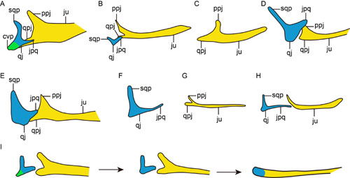 图2 方颧骨、颧骨形态在恐龙——鸟类中的演化(王敏供图)