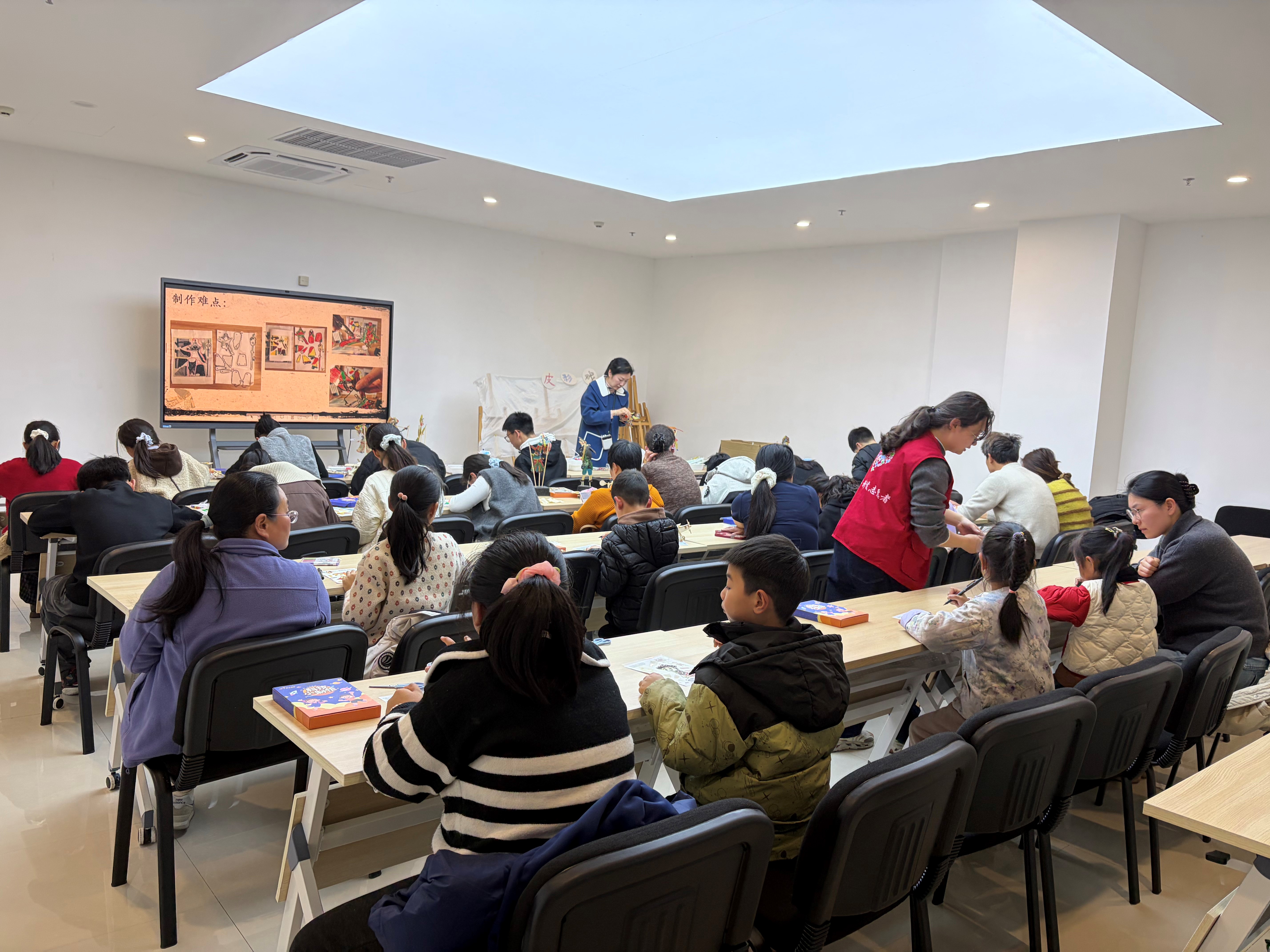 皮影制作环节同样精彩。孩子们在曹老师指导下,精心裁剪、上色、组装皮影,每一个步骤都认真专注。完成制作后,大家迫不及待地拿起皮影,在光影中演绎起趣味皮影戏,欢声笑语回荡在教室。